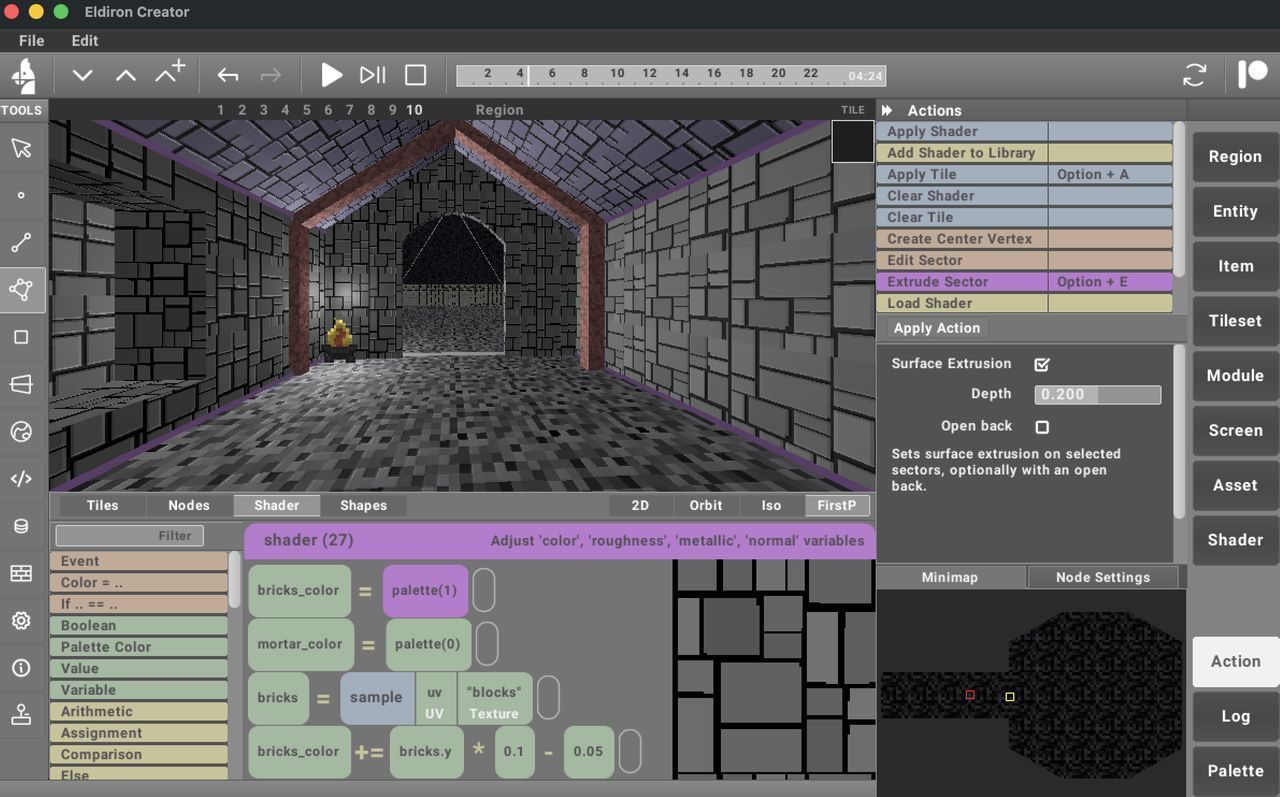 Помимо 2D-функциональности, Eldiron также поддерживает 3D. 3D-редактирование полностью интегрировано в редактор, что позволяет создавать новую геометрию или выдавливать и редактировать профили поверхностей без разрушения.