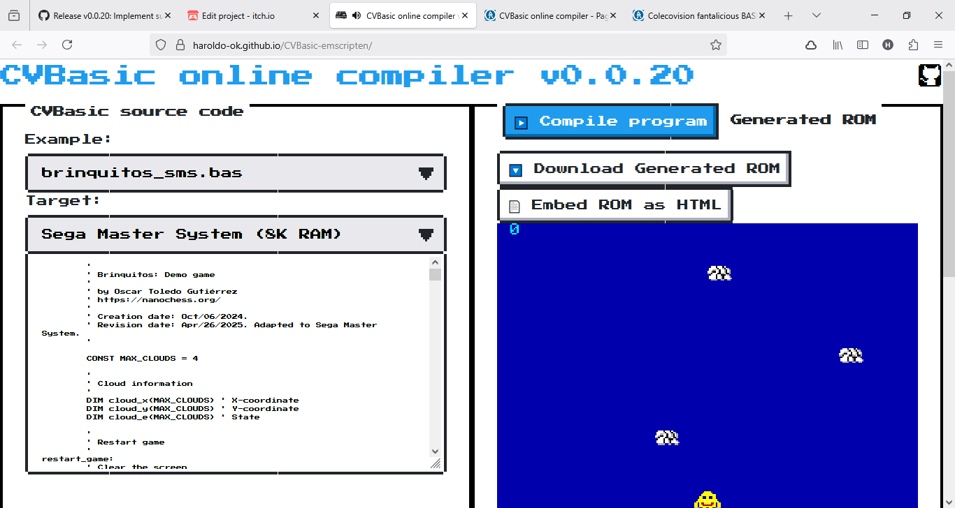 Программист haroldo-ok обновил CVBasic online compiler для написания проектов под ретро-системы Sega Master System и SG-1000. В этой версии добавлена кнопка для загрузки сгенерированного ASM. Также для увеличения/уменьшения отступа кода можно использовать клавиши Tab и Shift + Tab.